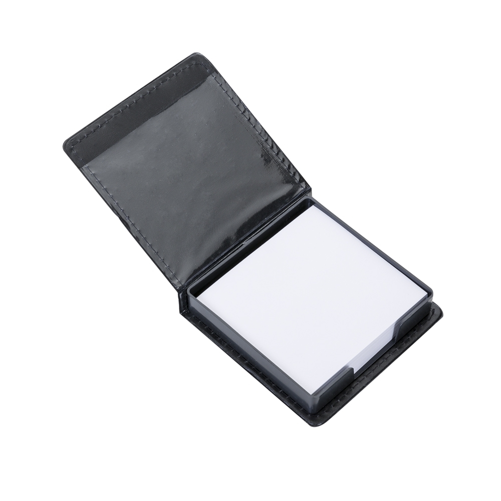 Bloco de anotações de couro sintético com detalhe na capa, parte interna com bolso plástico e bloco de folhas brancas com aproximadamente 145 folhas.