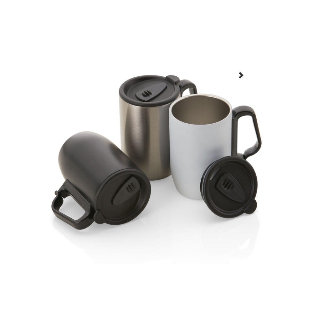 Caneca inox 380ml com parede dupla. Possui tampa plástica com trava para abertura do bocal, alça plástica estilo mosquetão e base com apoio EVA. Obs.: Conserva temperatura.