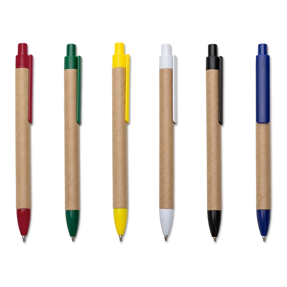 Caneta ecológica de papelão com detalhes coloridos. Além do amplo espaço para personalização no clip, o mesmo pode facilmente ser retirado para personalização no corpo da caneta. Clip e ponteira plástica, aciona por clique.