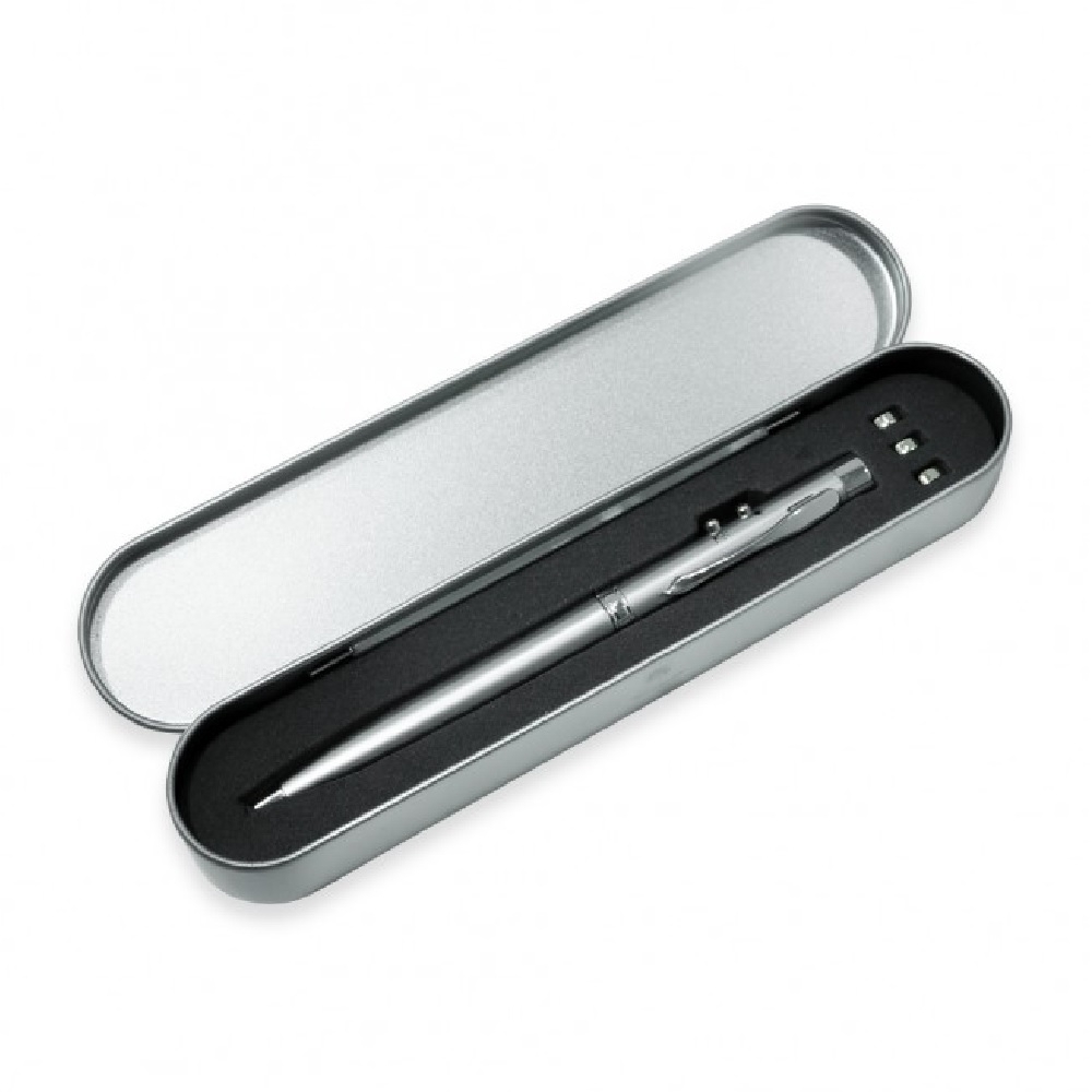 Caneta metal com laser e lanterna, possui desenhos indicativos ao lado dos botões. Para acionar a esferográfica basta girar o corpo da caneta. Acompanha três baterias LR41.