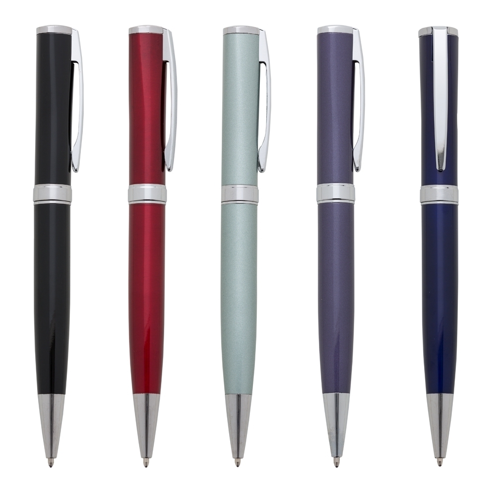 Caneta metal inteira colorida(pintura metalizada) com detalhes em prata, design executivo. Anel plástico e clip de metal, aciona por giro.