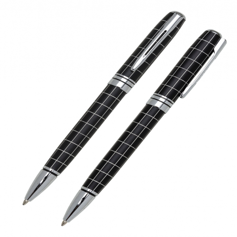Caneta metal preta inteira quadriculada, parte superior com retangulo preto liso para personalização. Possui clip metal com um traço vazado e ponta superior prata, três anéis centrais(dois com relevo preto) com relevo e anel inferior com relevo preto. Aciona por giro.