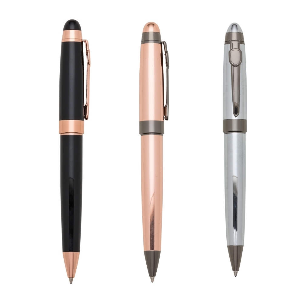 Caneta metal com detalhes coloridos. Clip metálico com formato de um brasão na parte superior, possui anel superior, central e ponteira colorida. Aciona por giro.