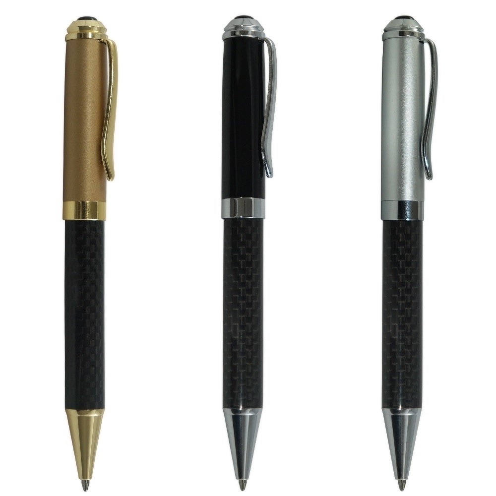 Caneta metal com detalhe quadriculado de fibra. Caneta nas versões champagne, prata ou preto na parte superior, ambas possuem detalhe circular preto superior e anel central. Clip metálico, aciona por giro.