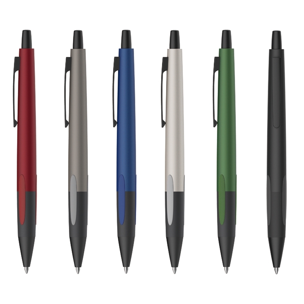 Caneta metal de pintura fosca colorida e detalhe na parte inferior emborrachado. Clip metálico preto, aciona por clique.