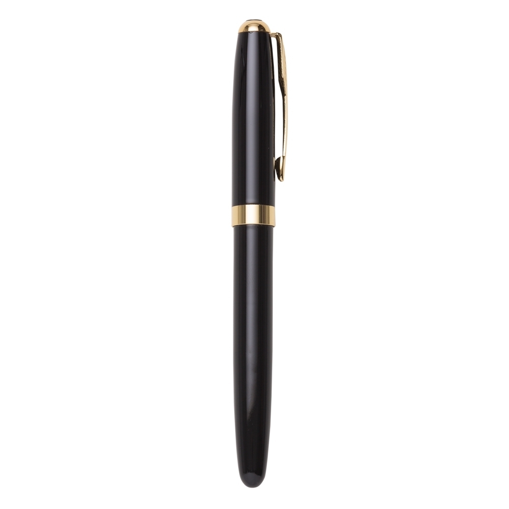 Caneta metal tinteiro preta com detalhes dourado. Clip metal dourado com detalhes superior em relevo e parte superior da tampa com detalhe circular preto. Parte interna com “seringa” para filtrar tinta da carga de “garrafa”. Caso tenha o cartucho de tinta não é necessário utilizar a seringa, basta colocar o cartucho no lugar. OBS.: NÃO ACOMPANHA TINTA. PEDIDO APENAS MÚLTIPLO DE 15 PEÇAS!