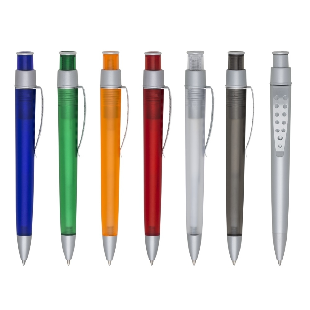 Caneta plástica fosca inteira colorida com detalhes prata. Clip de metal com doze furos, aciona por clique.