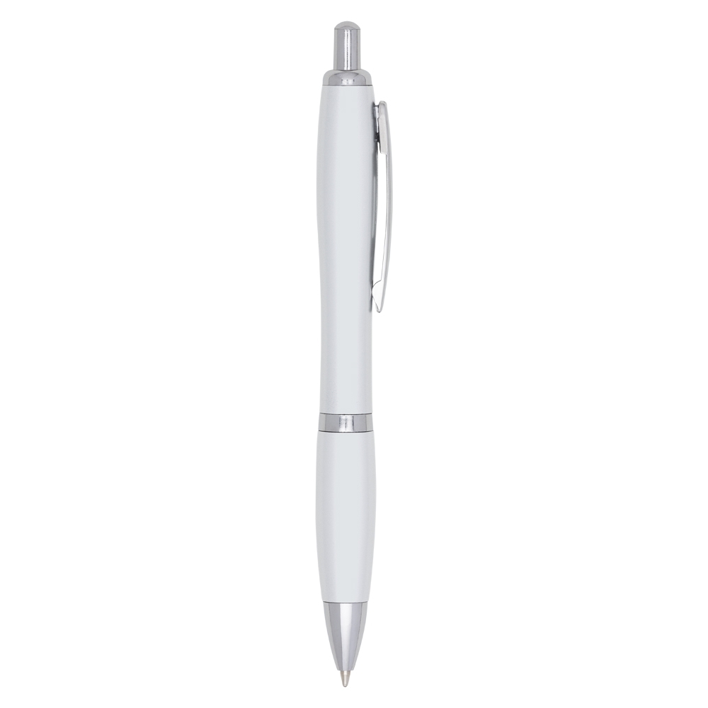 Caneta plástica branca com anel e detalhes prata. Clip de metal, aciona por clique.