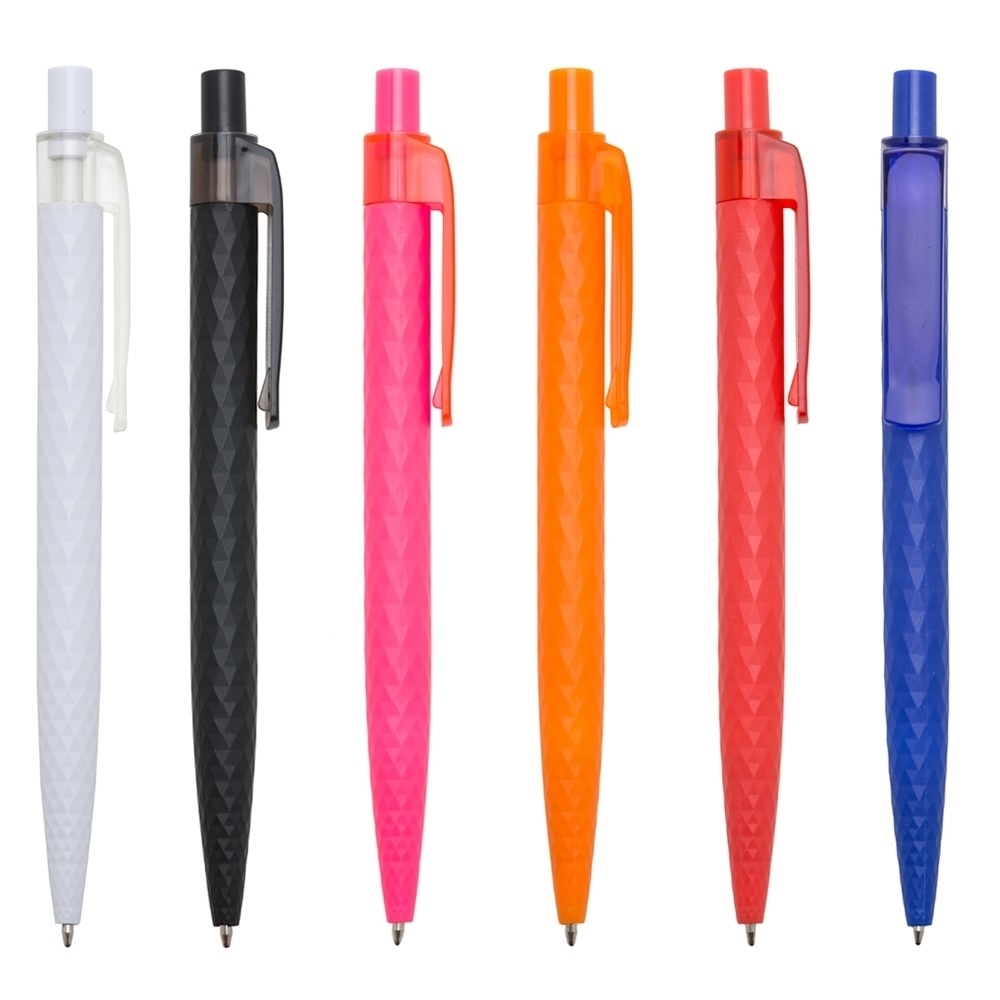 Caneta plástica inteira colorida com clip translúcido. Corpo inteiro de relevo com formato losango e clip plástico translúcido(pode ser removido para personalização). Aciona por clique.