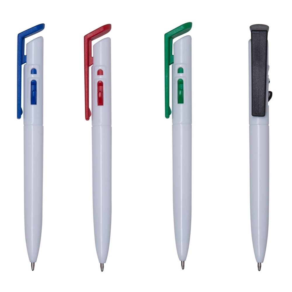 Caneta plástica branca com detalhes no acionador e destravador colorido. Aciona por clique e para destravar basta apertar a parte lateral ao clip.