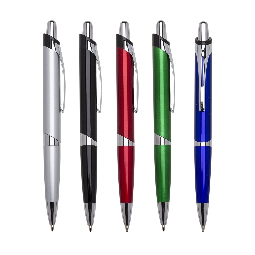 Caneta plástica inteira prata com detalhes coloridos. Possui clip de metal com um furo e um traço vazado, suporte do acionador preto e anel central prata. Aciona por clique.