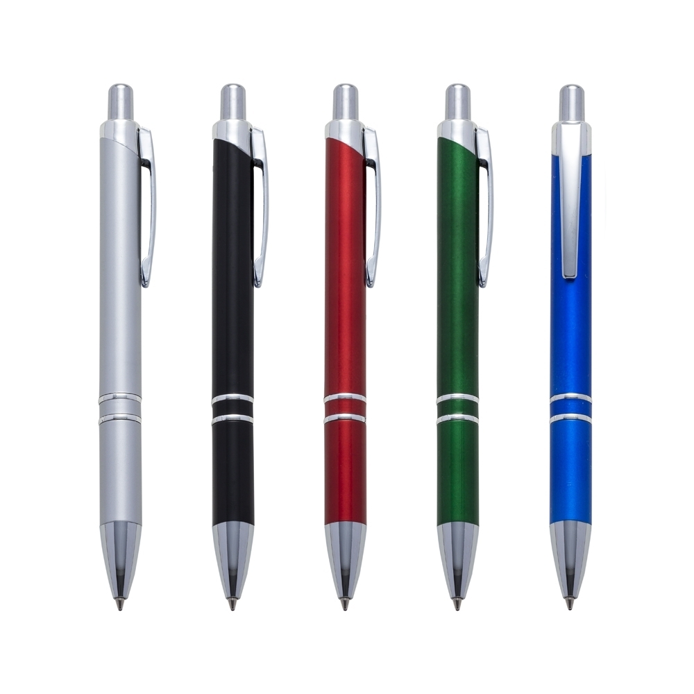 Caneta plástica inteira colorida com detalhes prata. Clip metal, possui dois anéis prata inferior. Aciona por clique.