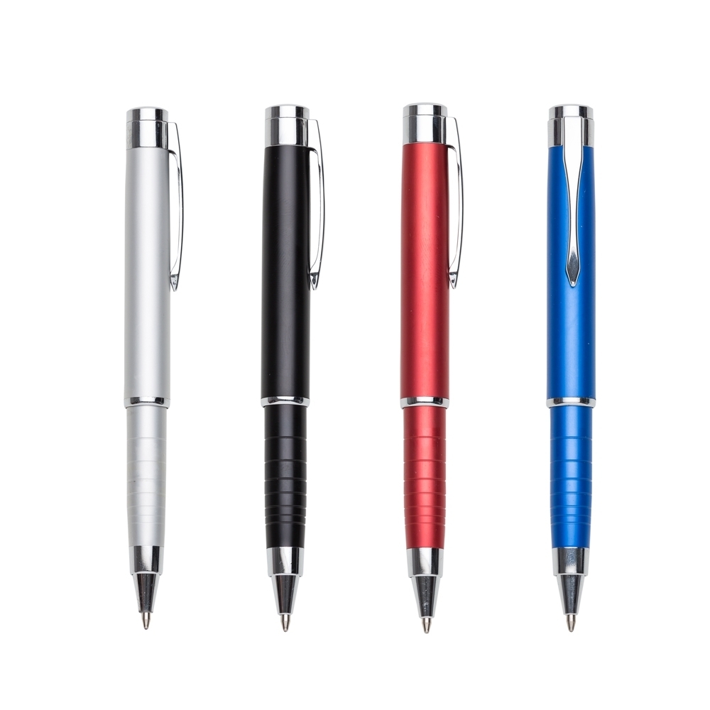 Caneta semi-metal retrátil de corpo colorido com detalhes prata. Clip metal prata com anel na parte superior, possui anel central e 7 anéis na parte inferior. Para utilizar basta puxar a parte frontal que é retrátil.