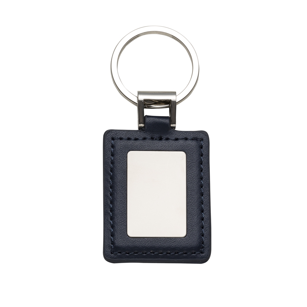 Chaveiro quadrado de couro sintético com chapa de metal fosca no centro, verso couro liso.