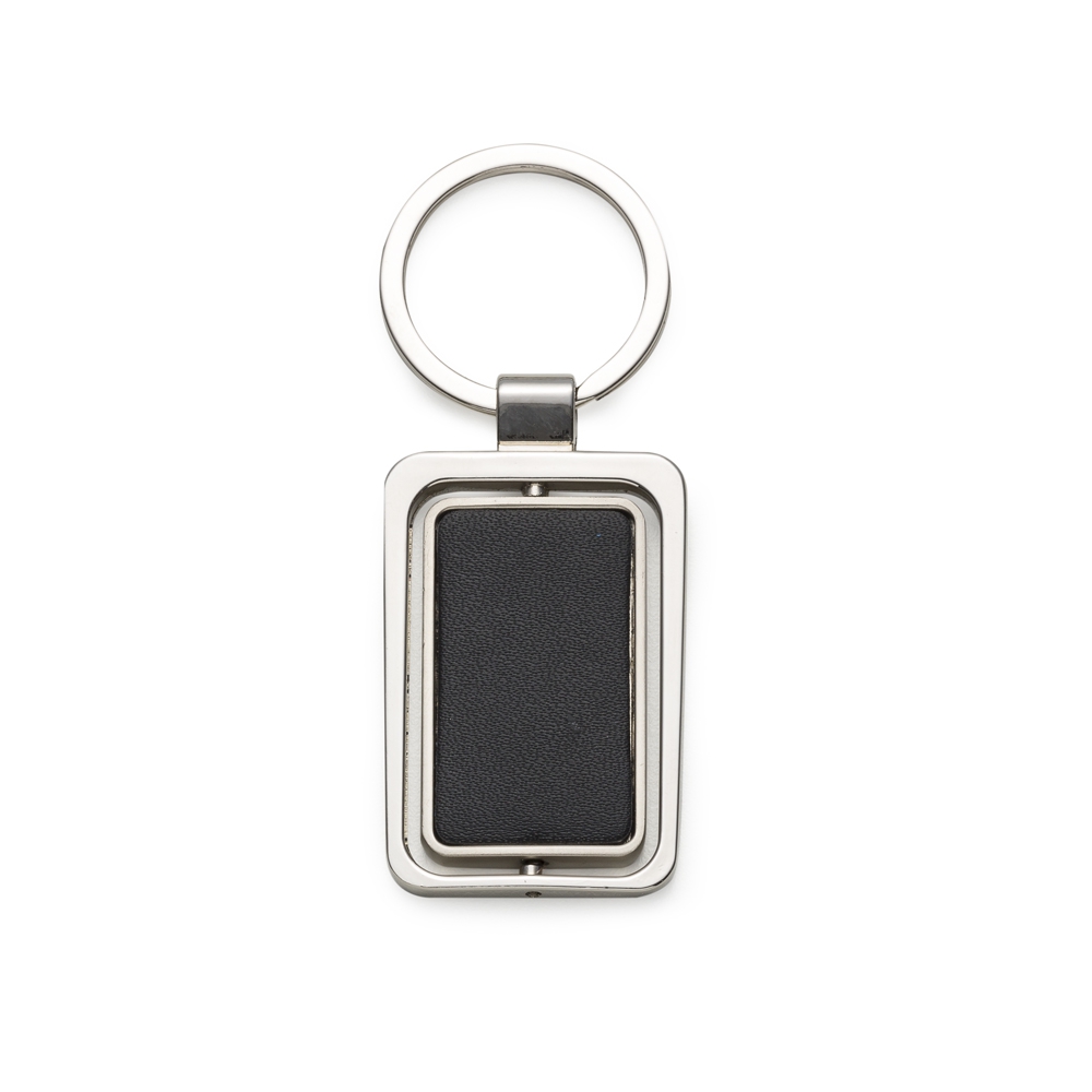 Chaveiro metal giratório retangular. Um dos lados metal fosco e verso preto emborrachado.