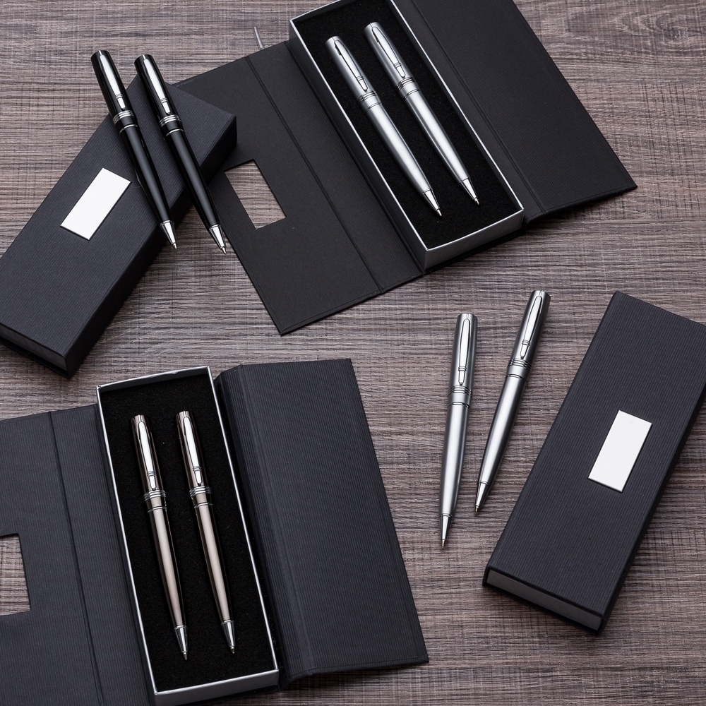 Conjunto caneta e lapiseira em estojo de cartonagem com placa central para personalização. Caneta/Lapiseira metal inteira colorida com detalhes prata, clip metal com duas “linhas” e na “ponta” superior detalhe de uma linha no meio. Possui três anéis abaixo do clip, anel centralizado e anel inferior e acionam por giro. Estojo revestida com espuma na parte interna.