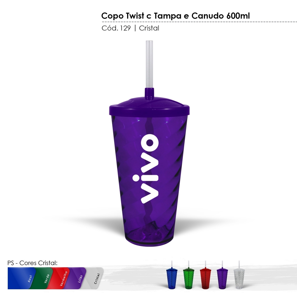 Copo personalizado Twist com Tampa Cristal de 600ml de capacidade, produzido com alta qualidade, matéria prima com alto brilho, parede de alta resistência e alta transparência