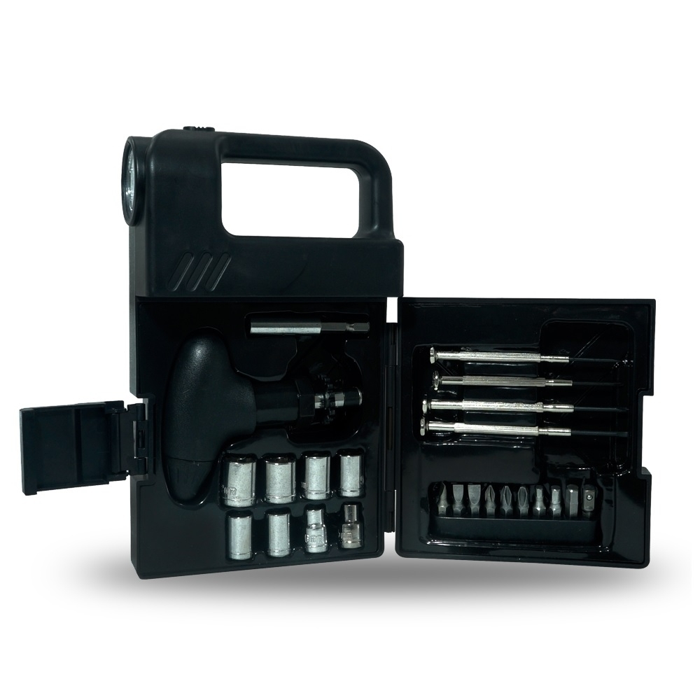 Kit ferramenta plástico com 24 peças e lanterna. Material plástico com alça, possui botão superior para ligar/desligar lanterna, trava de segurança amarela, possui um “X” em relevo em ambas laterais. Possui adaptador de chave de boca, catraca reversível, 8 extensores bocais(5MM, 6MM, 7MM, 8MM, 9MM, 10MM, 11MM e 12MM), 2 mini chaves Philips, 2 mini chaves de fenda e conjunto 10 pontas(4 chaves phillips, 3 chaves fenda, 2 chaves torx e um adaptador). Possui compartimento lateral para encaixe de 4 pilhas AA(não companha).