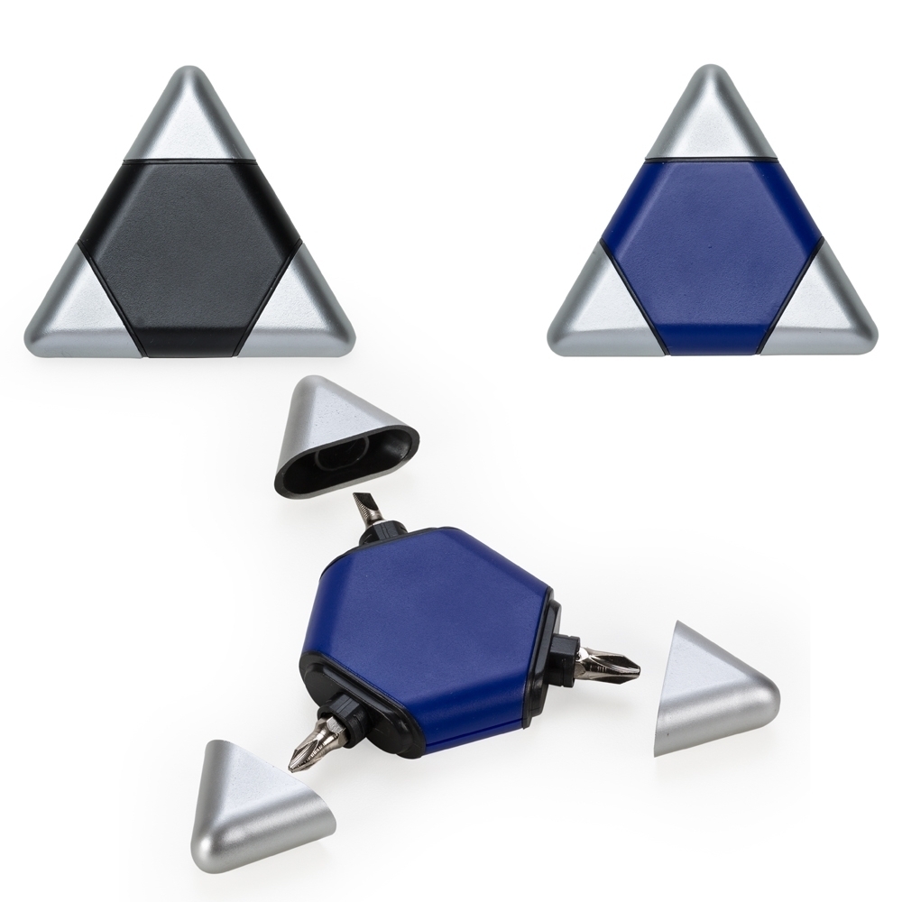 Kit ferramenta triangular plástico com 3 peças. Material plástico colorido com três tampas prata, ao puxá-las contém: duas chaves philips de tamanhos diferentes e uma chave de fenda.