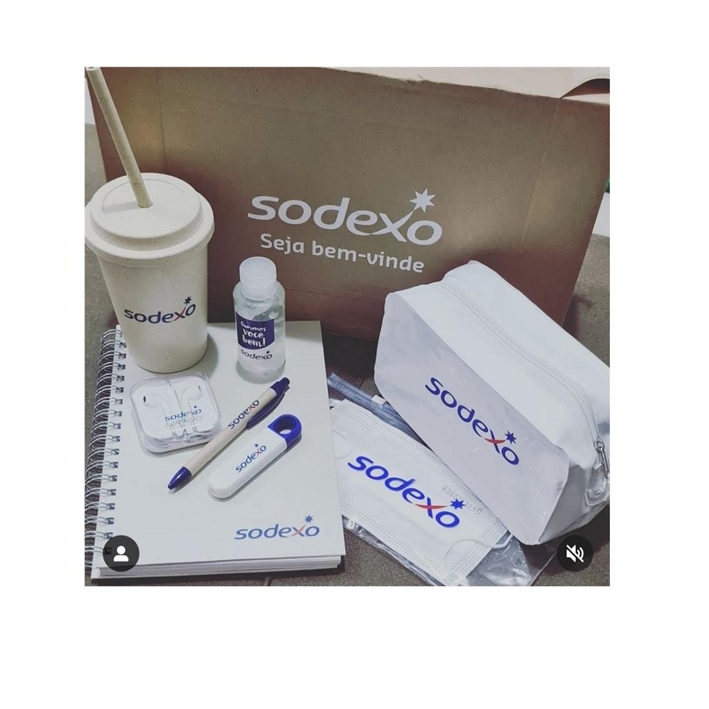 Fone, Caneta, escova bucal, agenda, Álcool de bolsa, copo com canudo eco, necessaire, mascara facial. Sacola em papel Kraft.