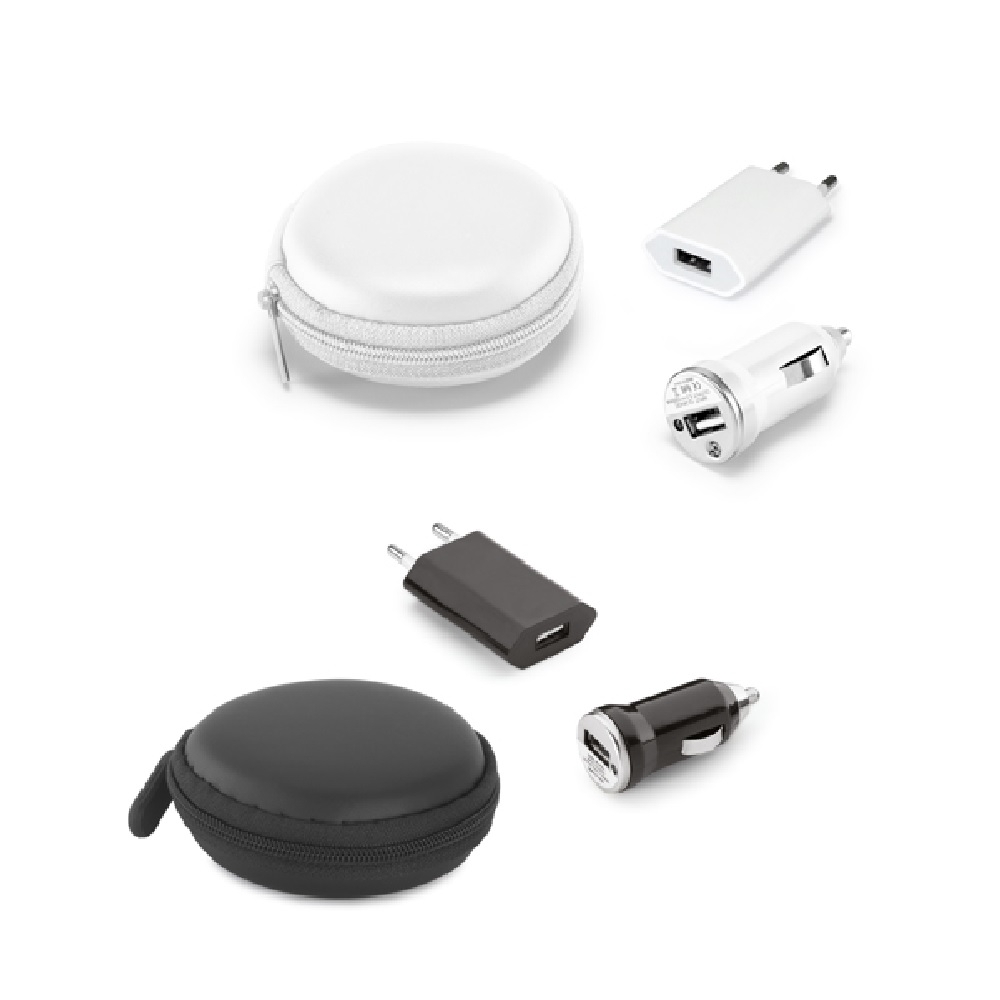 Kit de carregadores USB. ABS. Incluso carregador de corrente DC 110V/220V e carregador para carro DV 12-24V. Fornecido com bolsa EVA. Bolsa: ø75 x 36 mm