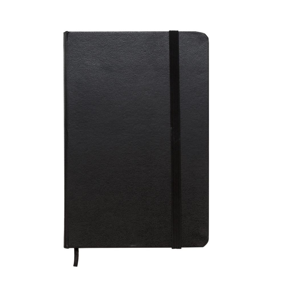 Caderneta brochura tipo moleskine com capa dura e marca página de cetim, possui compartimento/bolso interno no fim do bloco e contém aproximadamente 80 folhas sem pauta.