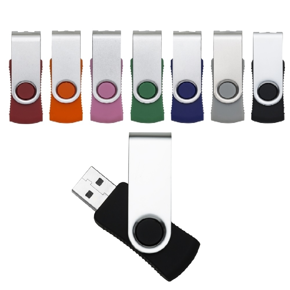 Pen drive de metal giratório, parte interna preta em plástico resistente com relevo nas laterais. Possui dois “furos” na parte em metal que poderá ser utilizado para colocar algum cordão.