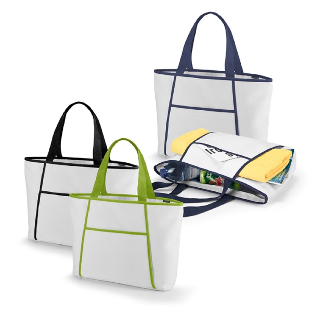 Sacola térmica. 600D. Fecha com zíper. Compartimento exterior aberto (forrado) com bolso frontal. Alças em webbing de 55 cm. Capacidade até 9 litros. Food grade.