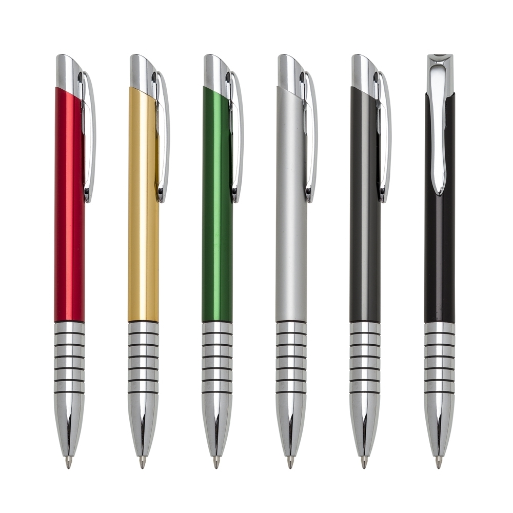 Caneta metal colorida com detalhes prata. Clip de metal, possui seis anéis pratas na parte inferior com relevo preto entre eles, Aciona por clique.
