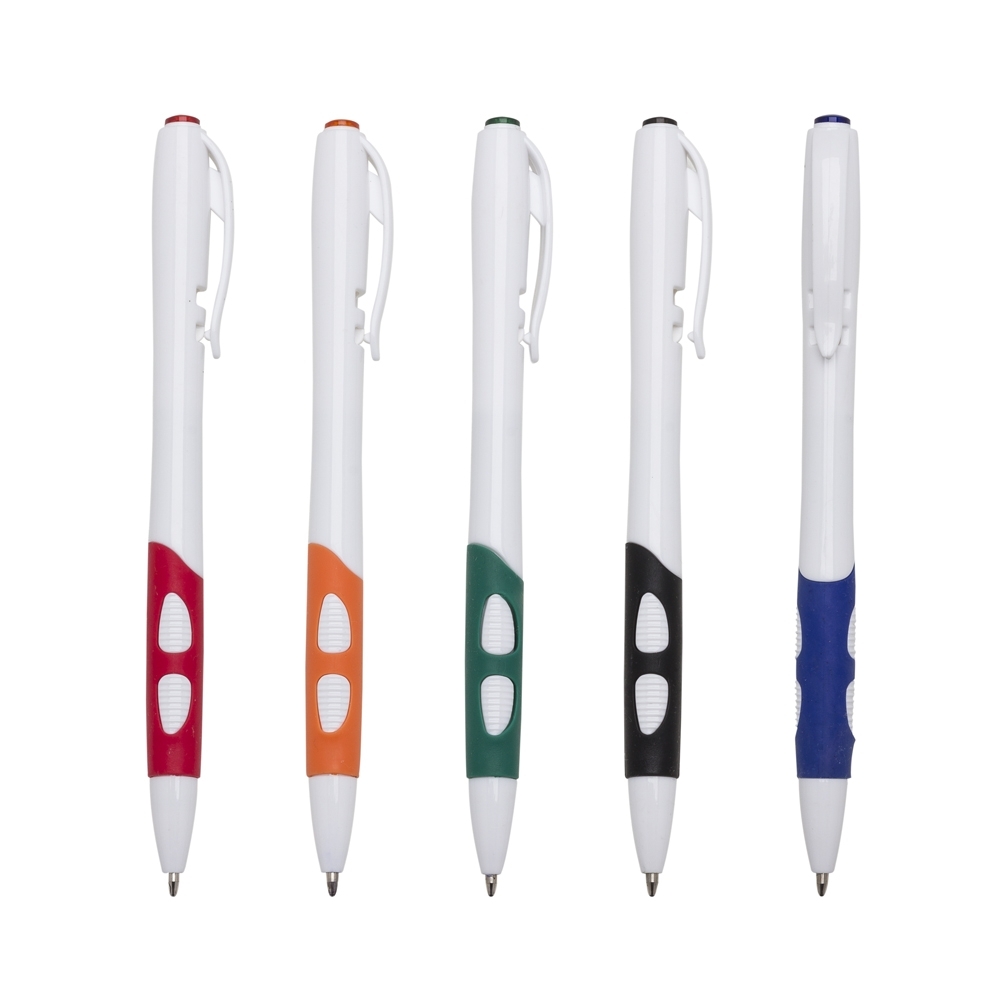 Caneta plástica branca com detalhe emborrachado colorido. Ponta do acionador colorido, parte inferior emborrachada com quatro detalhes em relevo. Aciona por clique, para destravar bastar pressionar o clip.