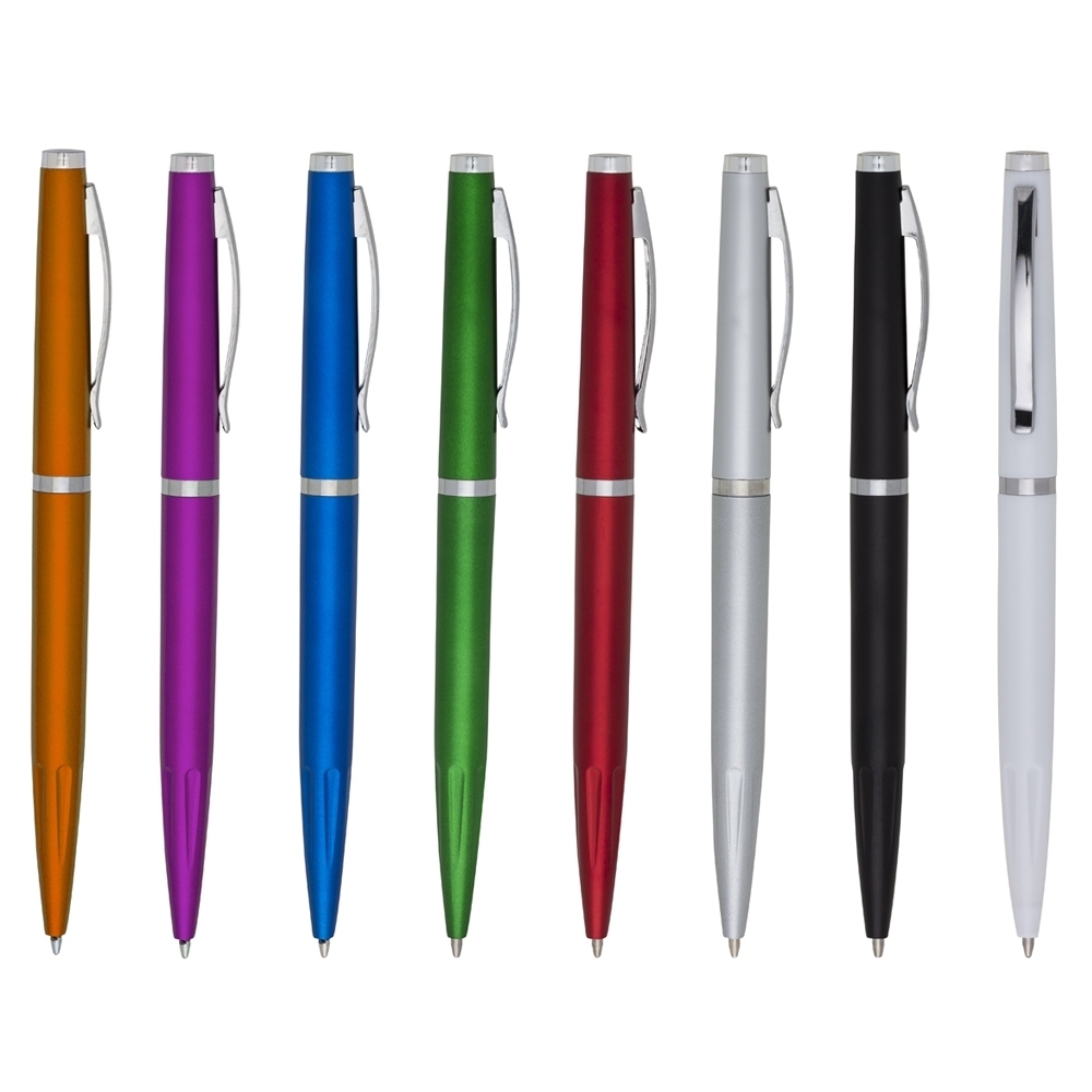 Caneta plástica com design fino, corpo colorido e detalhes em prata. Possui o clip em metal e parte inferior com relevo, aciona por giro.
