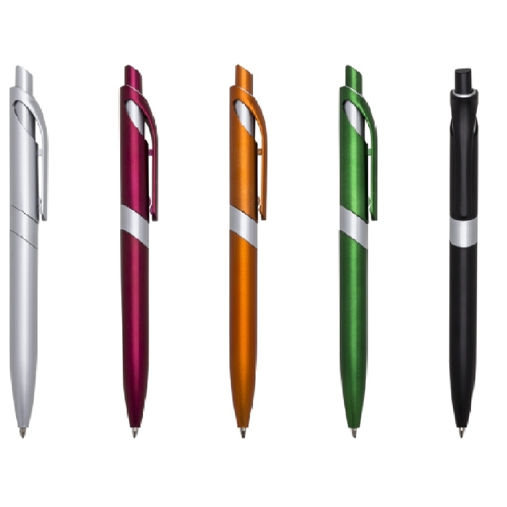 Caneta plástica inteira colorida com detalhes prata. Clip plástico com detalhes atrás vazado, possui uma espécie de anel no centro. Aciona por clique.