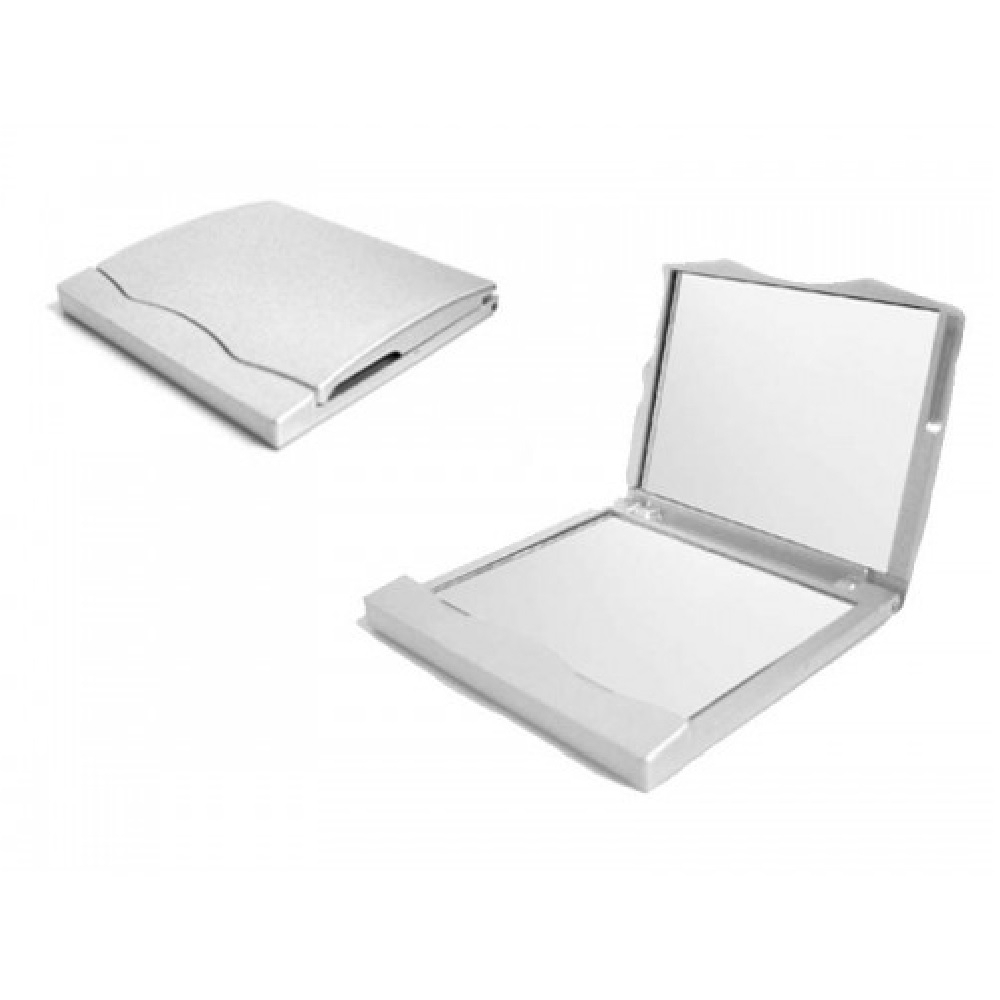 Espelho plástico duplo com aumento. Frente e verso liso porém a parte superior não é plana, possui um detalhe de ondulação.