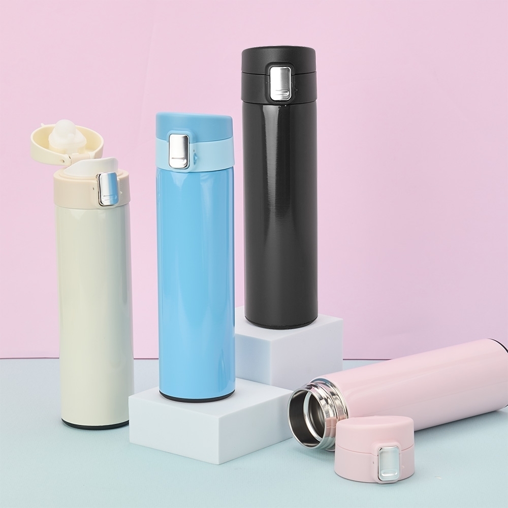 Garrafa térmica em inox 304 com parede dupla, capacidade de 450ml. Tampa com botão de acionamento e trava de segurança.