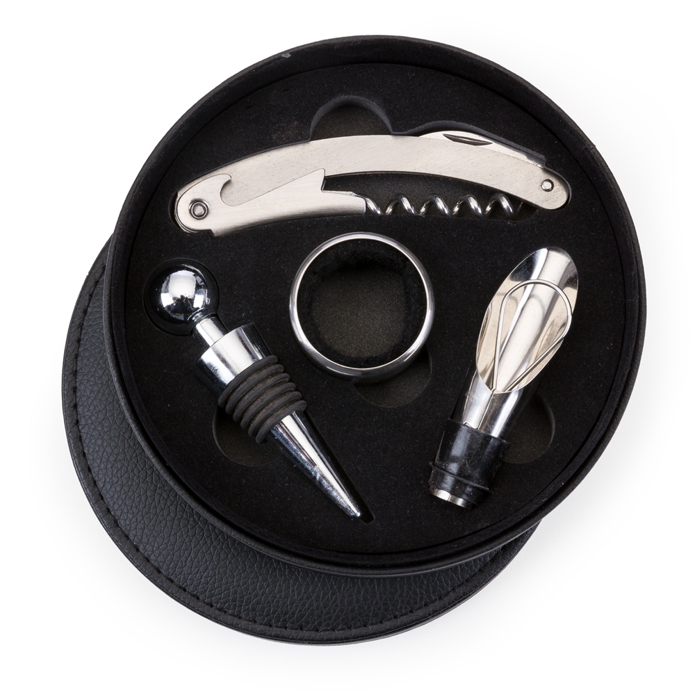 Kit vinho 4 peças com estojo redondo de couro sintético, parte interna revestida com espuma. Contém: saca rolha, wine collar, tampa de bico e anel de gargalo PEÇAS EM AÇO INOX. Acompanha plaqueta de metal para personalização.