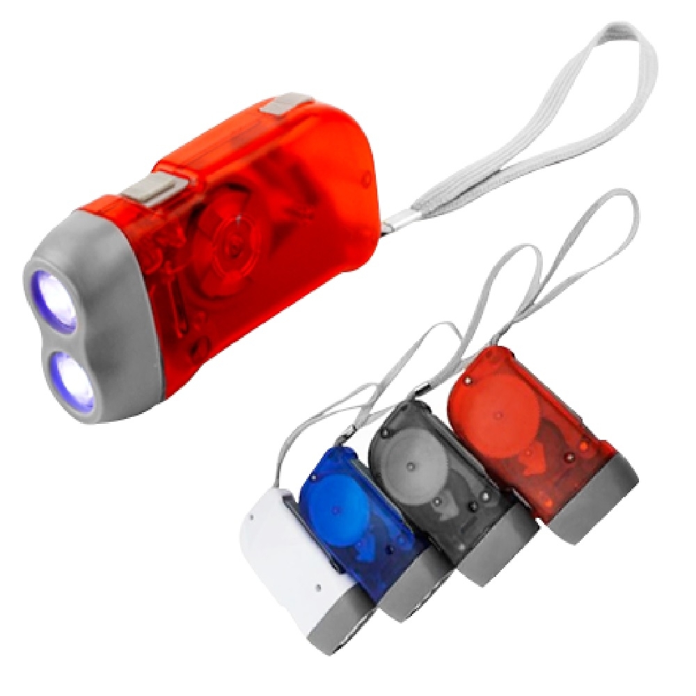 Lanterna plástica com 3 leds, pressionando o “gatilho” gera energia para alimentar a lanterna dínamo. Possui botão para ligar/desligar lanterna, botão para travar gatilho e acompanha cordão.