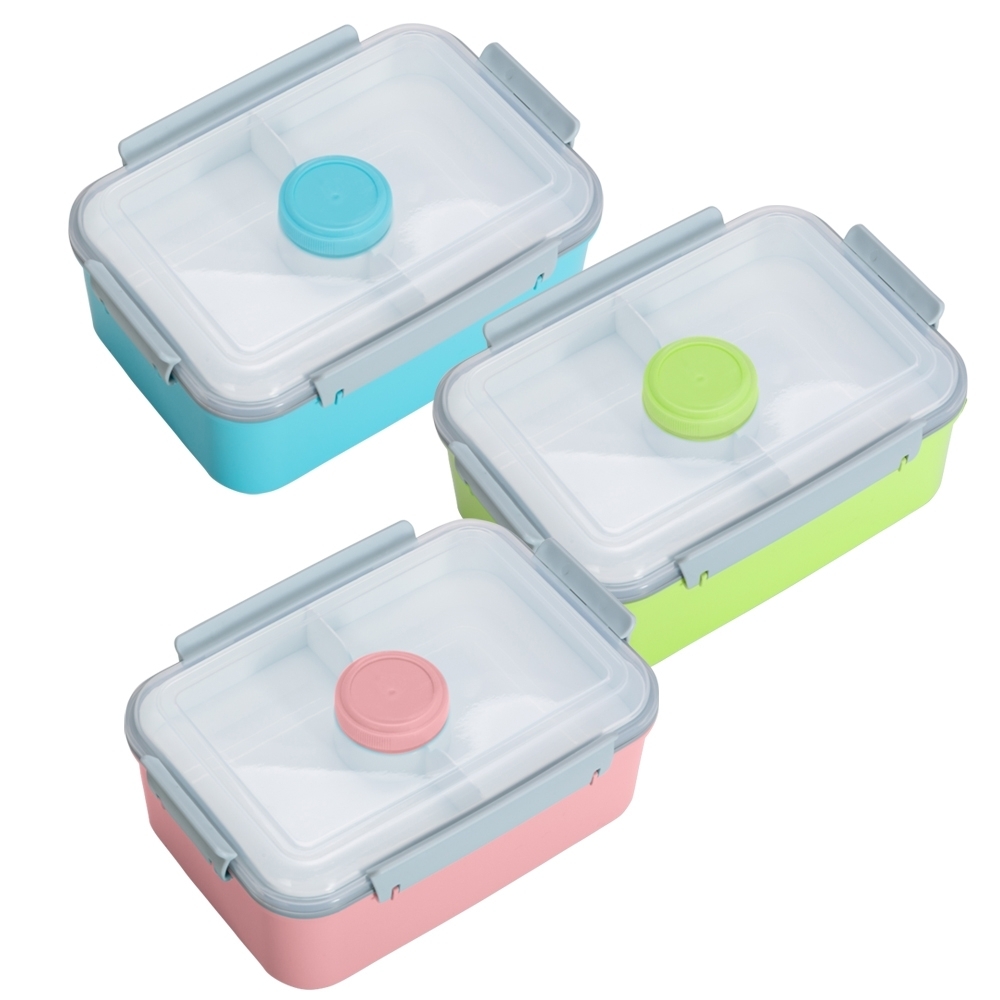 Marmita plástica com divisão de compartimentos. Possui tampa plástica transparente; recipiente com tampa colorida para temperos; tampa branca superior com duas divisórias e compartimento da marmita colorido com quatro lacres cinza, sendo um em cada lateral.