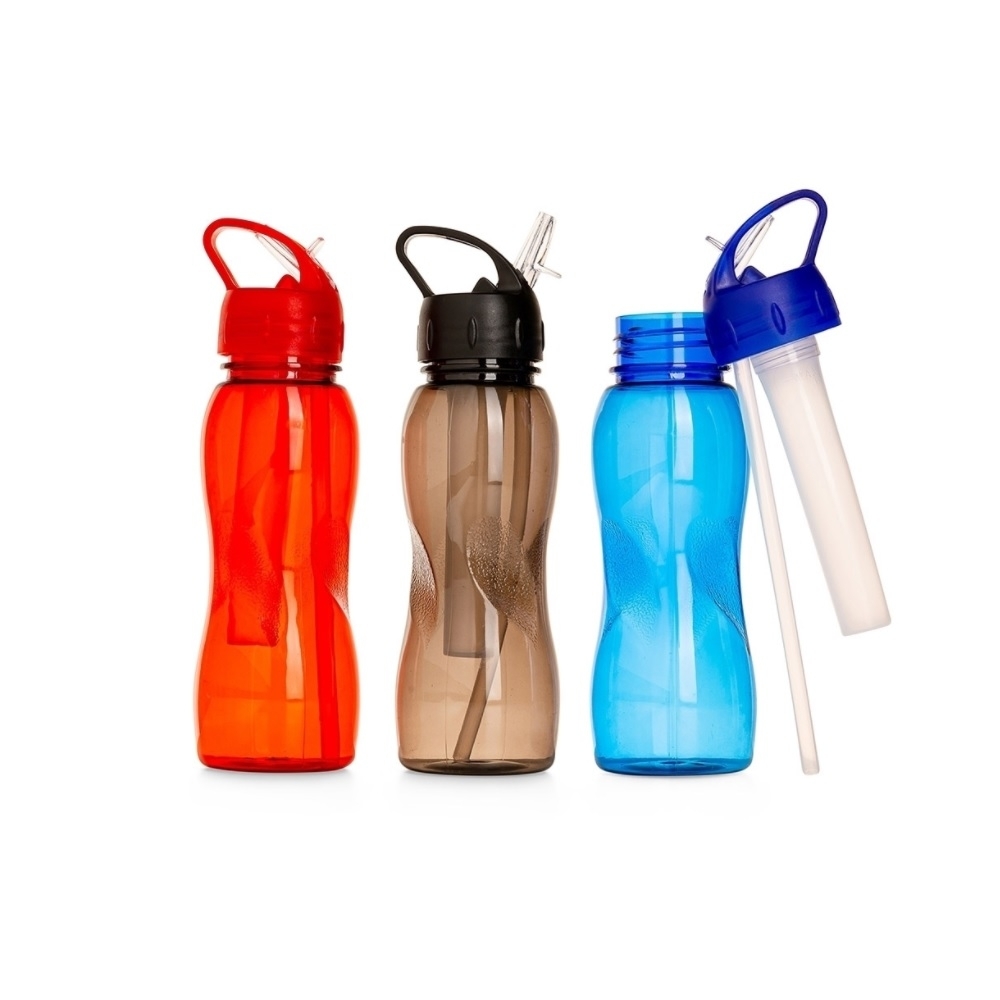 Squeeze plástico 650ml com ice bar e canudo interno. Squeeze com detalhes texturizados no corpo e detalhes em relevo na tampa, parte interna com ice bar, para utilização desta é necessário encher a barra e colocá-la no congelador ou freezer para gelar, depois e só colocar novamente no squeeze.